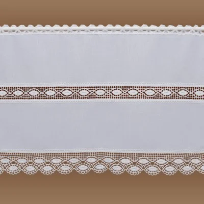 Ab einer Höhe von 46 cm wurde ein zusätzlicher Spitzeneinsatz eingearbeitet. Das verwendete Spitzenmotiv gehört zu den Klassikern unseres Unternehmes und wird nach wie vor auf traditionelle Weise in Plauener Spitzenstickerei ausgeführt.