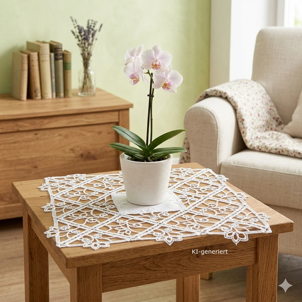 Holen Sie sich ein Stück vogtländische Handwerkskunst direkt in Ihre Küche oder Ihr Wohnzimmer. Das quadratische Deckchen Sissi (27 x 27 cm) besticht durch seine filigrane Luftspitzen-Stickerei, die jedem Raum eine warme und zugleich edle Atmosphäre verleiht. Ob auf dem Esstisch, der Anrichte oder im gemütlichen Ferienhaus – diese Spitzendecke ist mehr als nur ein Küchenaccessoire; sie ist Ausdruck von Stil und Liebe zum Detail.