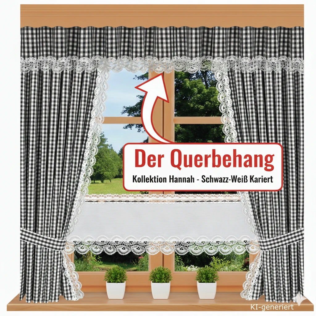 Moderner Akzent mit Tradition! Der schwarz-weiß karierte Querbehang Hannah kombiniert grafische Kontraste mit zarter vogtländischer Spitze. Handgefertigt in Deutschland – der edle Blickfang für Ihr Fenster.