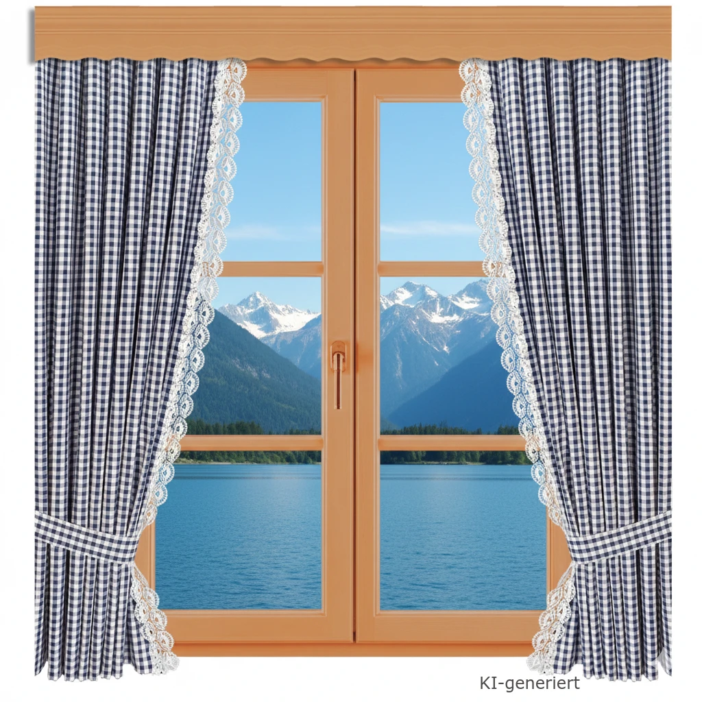 Verleihen Sie Ihrem Zuhause echten Landhaus-Charme mit dem 4-teiligen Vorhang-Set Hannah. Hochwertiges blau-weißes Karo-Muster trifft auf edle Plauener Spitze – ein langlebiger Blickfang für stilvolle Fensterdekoration.
