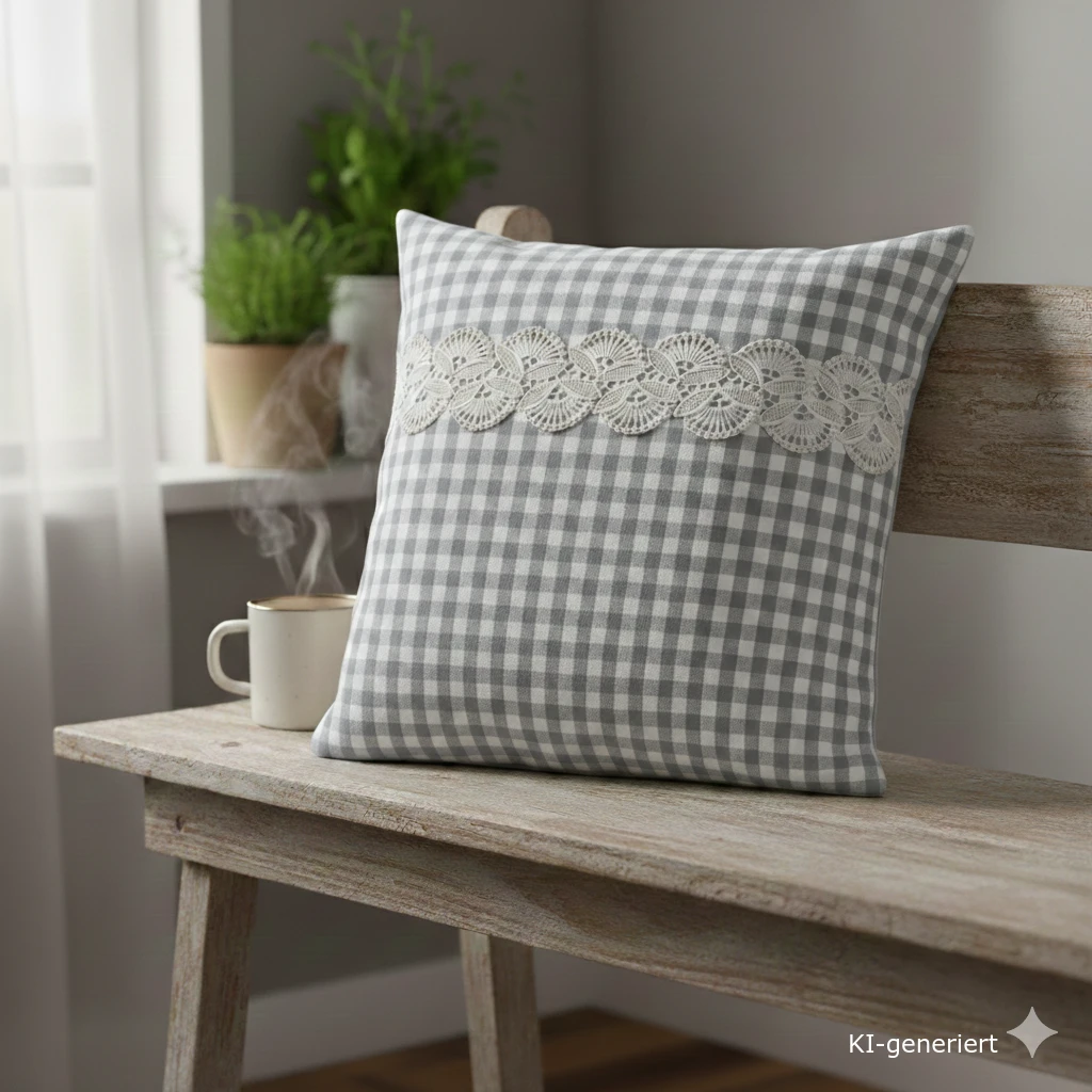 Kissenhülle Hannah grau-weiß kariert mit Vogtländischer Spitze | Edler Landhaus-Stil