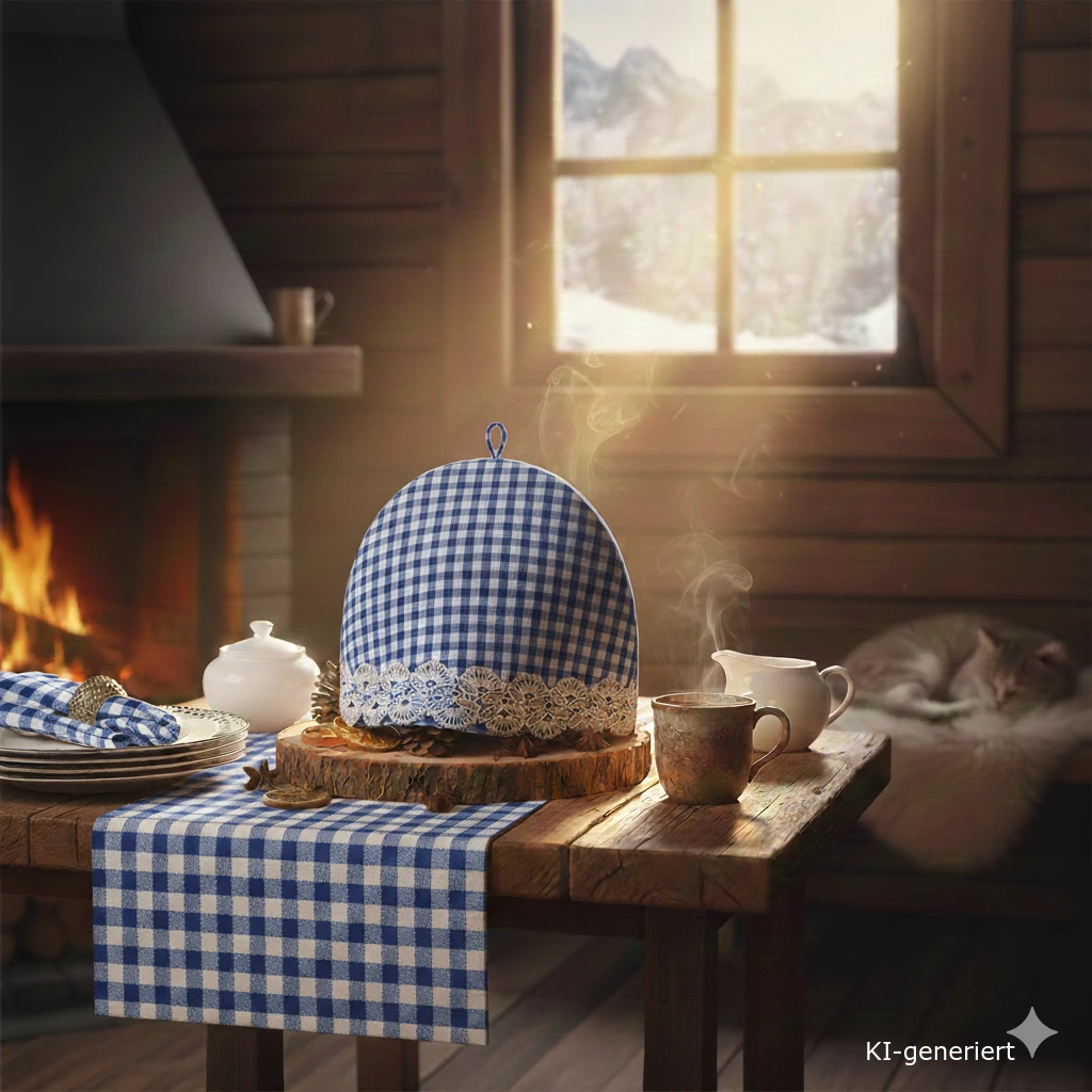 Material: 100% Baumwolle (Gewebe), Füllung und Spitze aus 100% Polyester. Design: Blau-weiß kariert mit feiner vogtländischer Spitze. Maße: ca. 26 x 32 cm – passend für alle gängigen Teekannen und Kaffeekannen. Herkunft: Hergestellt unter der Marke kollektion.MT in Deutschland.