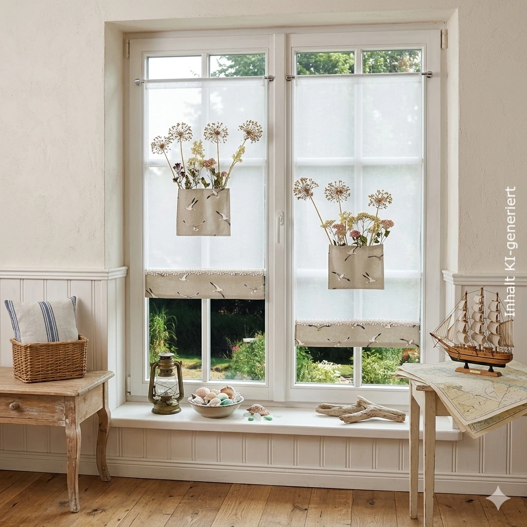 Das Herzstück dieser Kurzgardine sind die liebevoll eingearbeiteten Taschen. Wir laden Sie ein, selbst zum Designer zu werden: Dekorieren Sie die Taschen ganz nach Ihrem Geschmack mit getrockneten Blumen, Gräsern oder kleinen maritimen Schätzen. So wird jede Scheibengardine zu einem persönlichen Unikat, das beim gemeinsamen Essen für eine inspirierende Atmosphäre sorgt und Ihre Liebe zum Detail unterstreicht.
