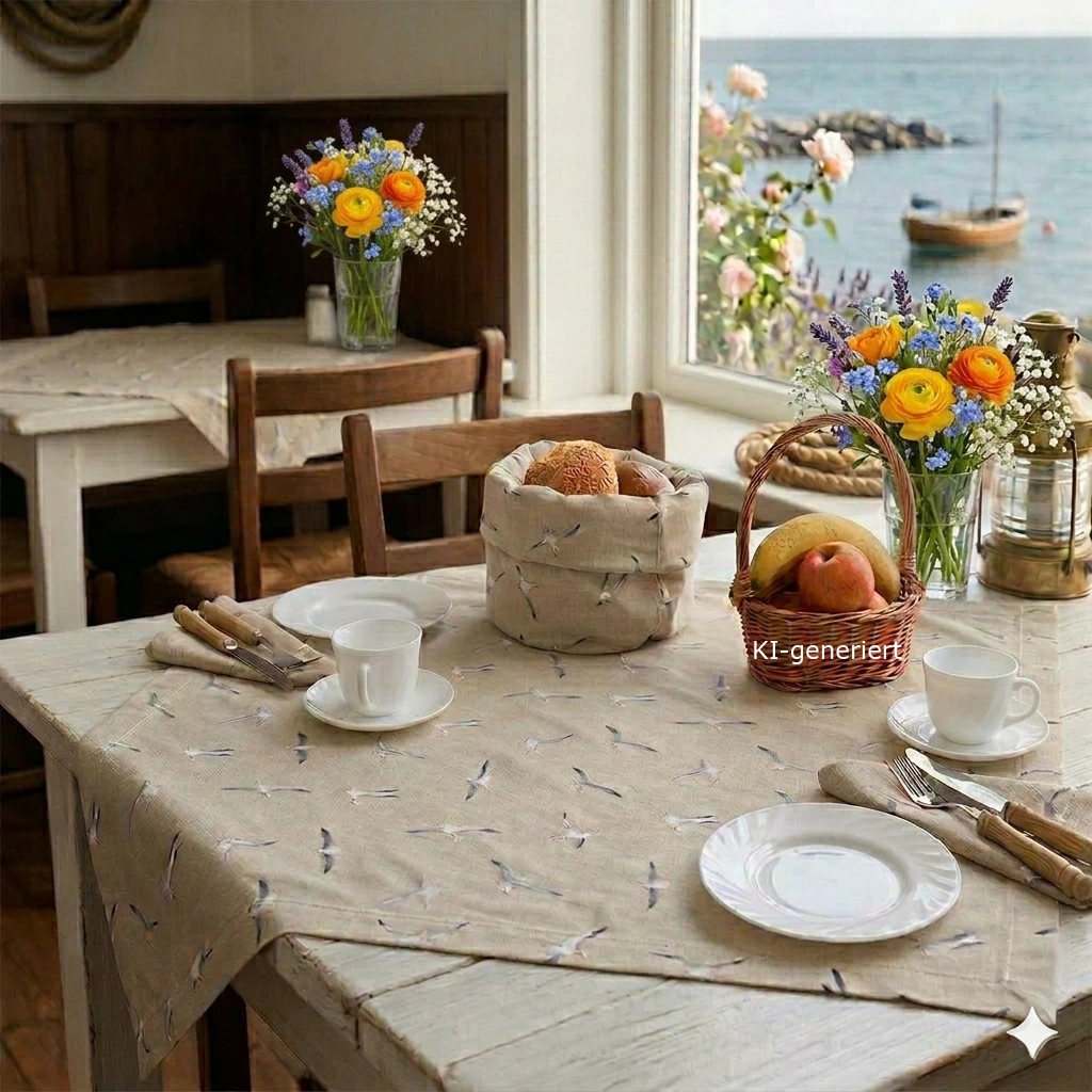 Verwandeln Sie Ihren Essbereich in eine Oase der Ruhe. Mit der Mitteldecke Ilma Möwe in natur holen Sie sich das entspannte Gefühl eines Küstenurlaubs direkt an den Tisch. Das dezente Design mit fliegenden Möwen strahlt Leichtigkeit und Tradition aus. Ob beim gemütlichen Sonntagsbrunch oder im täglichen Gebrauch – diese Tischdecke im Landhaus-Stil ist ein echtes Highlight für jede Küchendekoration.